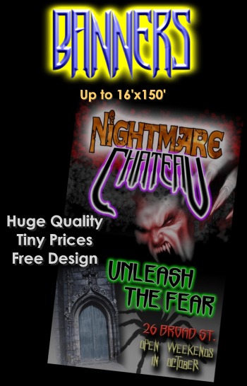 We can also make stand-up signs, real-estate style signs, inexpensive lawn signs, we can die cut all of our signs, etc. We are very flexible, and we are haunters ourselves. If you need any sort of full-color banner or sign, printed on just about anything, we can probably help you. Contact us for details. Our prices are VERY LOW, and we do the graphic design for free!