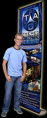 Retractable Banner Stand. Super convenient for trade shows, and for banners at your attraction that you take inside when you close or that you need to be able to move. This is a banner that unrolls out of a high-quality stand on the floor. Sets up in about 60 seconds, and every retractable stand comes with a convenient carrying bag. The image is printed on our Smooth Indoor Banner material. We use high-quality Orient, Elevate, and Contender retractable banner stands for years of reliable use, not cheap imitations that can break easily. The Orient retractable banner stands unroll to a total overall height (banner + stand) of 86¼" (7'2¼"). The Elevate retractable banner stands have an overall height of 97" (8'1"). The Contender retractable stands are available in two different overall heights: 79½" (6'7½") high and 106½" (8'10½") high. Remember: We do the banner design for free! Below, please see the retractable banner images and pricing options: