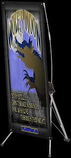 Tristand (tripod stand) with Banner. This is a banner that comes with a very lightweight and convenient tripod stand in a choice of three sizes. (Please see the image here on the left.) Especially useful for banners displayed outside your attraction, or at your table or booth at conventions and trade shows. The smallest of these Tristands can stand right on a table. The banner stand itself quickly disassembles and stores in an included carrying bag when not in use, and you can roll up the banner into a small stiff cardboard storage tube that we provide. It takes about 2 minutes to set up the Tristand — assemble the banner stand itself in seconds, and then screw in the threaded screws through the grommets in the 4 corners of your custom banner. One big advantage of the Tristand over a retractable banner, above: The Tristand lets you use different banners for different occasions, while still using the same stand (we just make another banner for you to use with the stand). We use high-quality Tristand banner stands for years of reliable use, not the cheap imitations that can break easily. Remember: We do the banner design for free! Below are our Tristand options in three different heights: